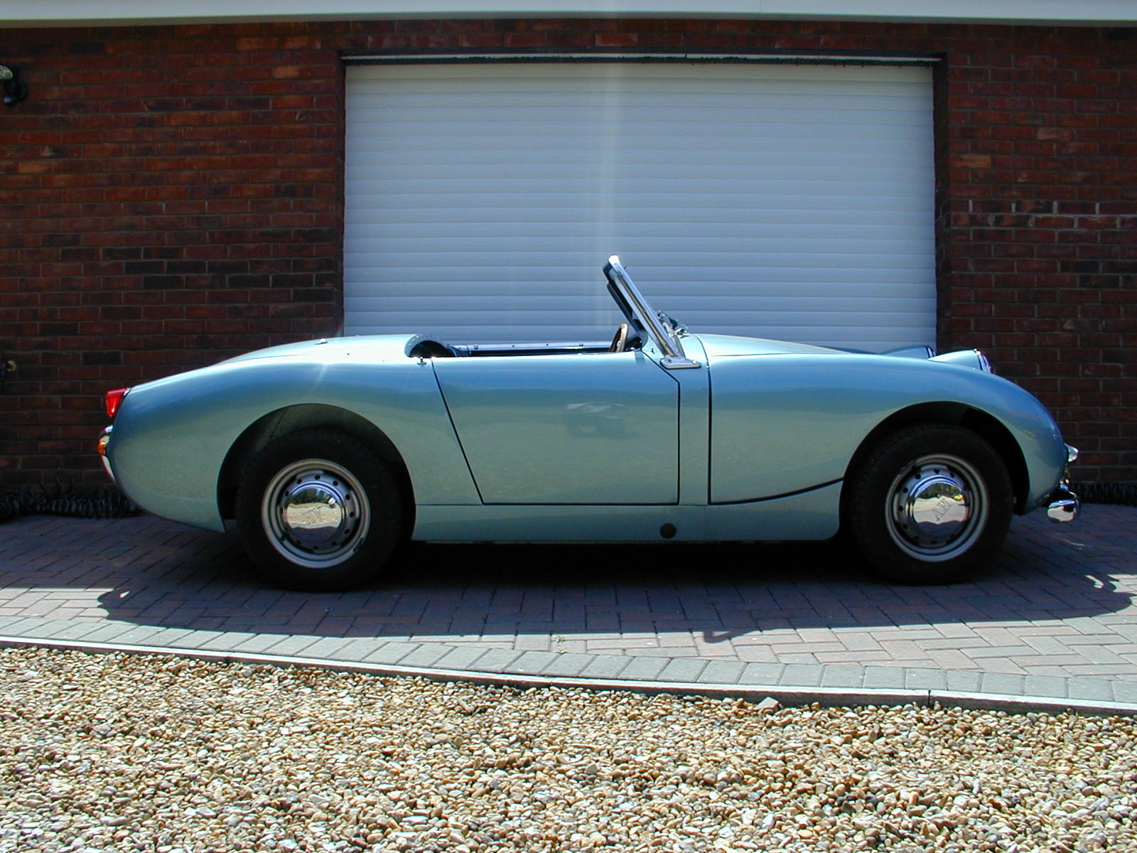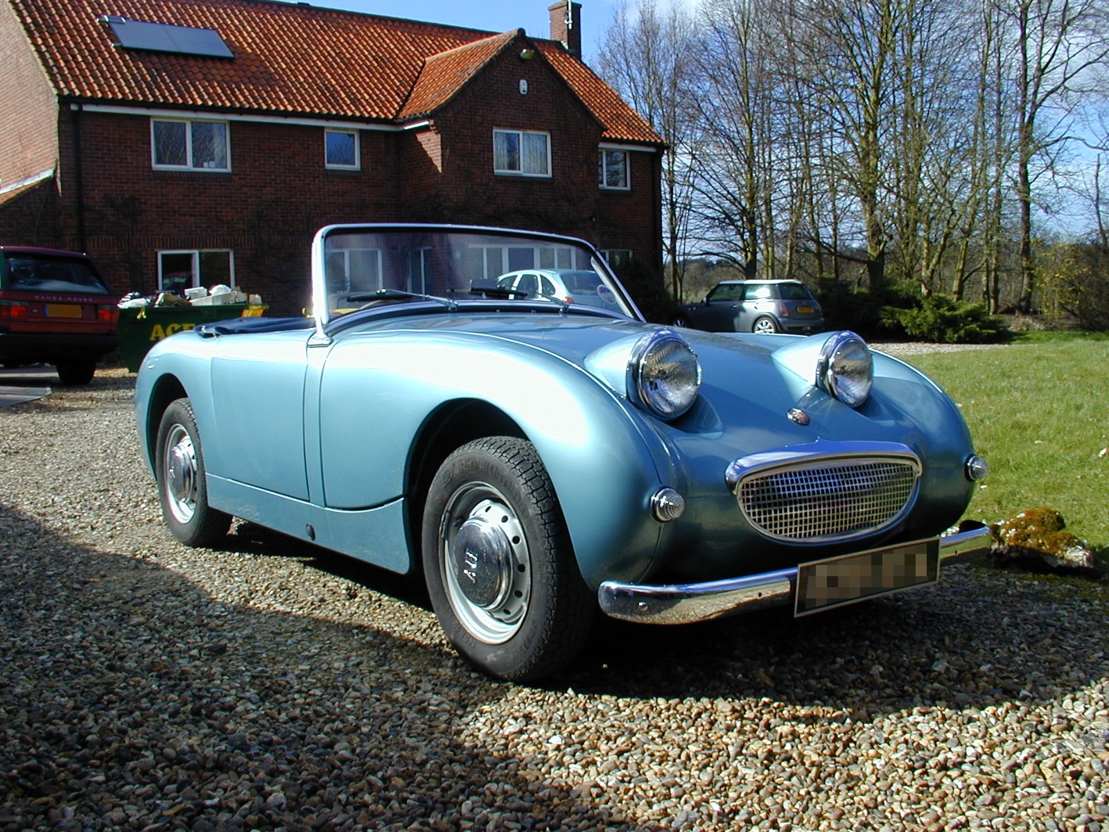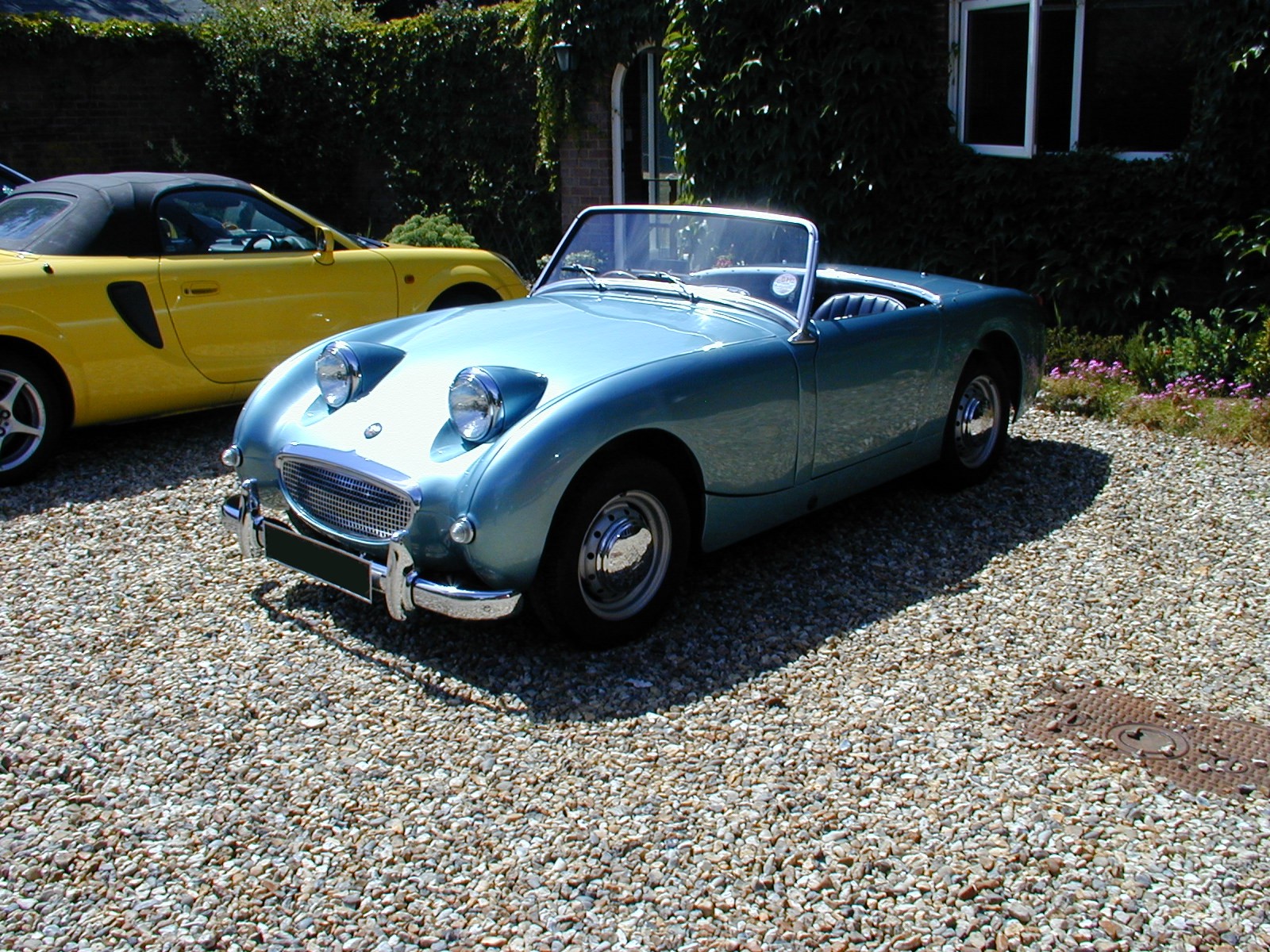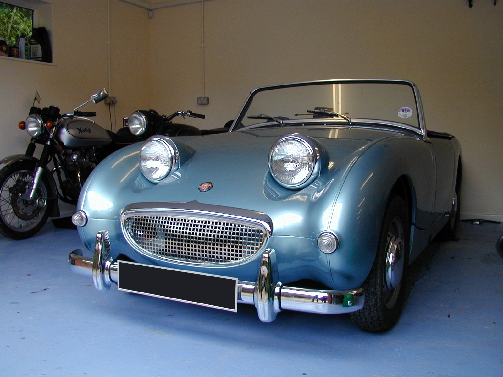 This (my Dad’s car) is of 1958 vintage, and has been totally restored and upgraded. It has the original body (with a steel bonnet) but it has late midget running gear and a 1275cc engine (new in 1991). Consequently its a great little car! And it kinda stops too!! (for a Sprite!).