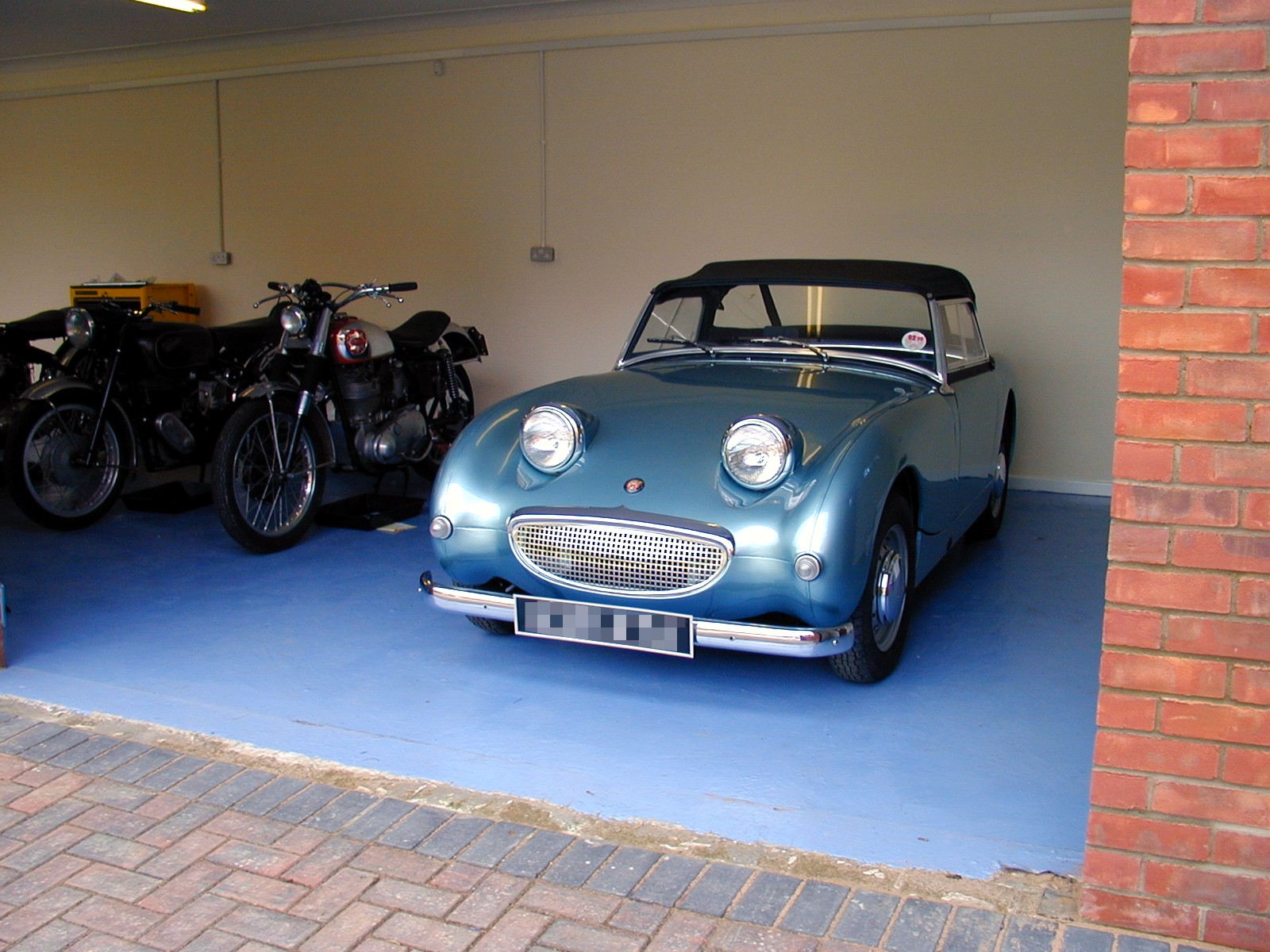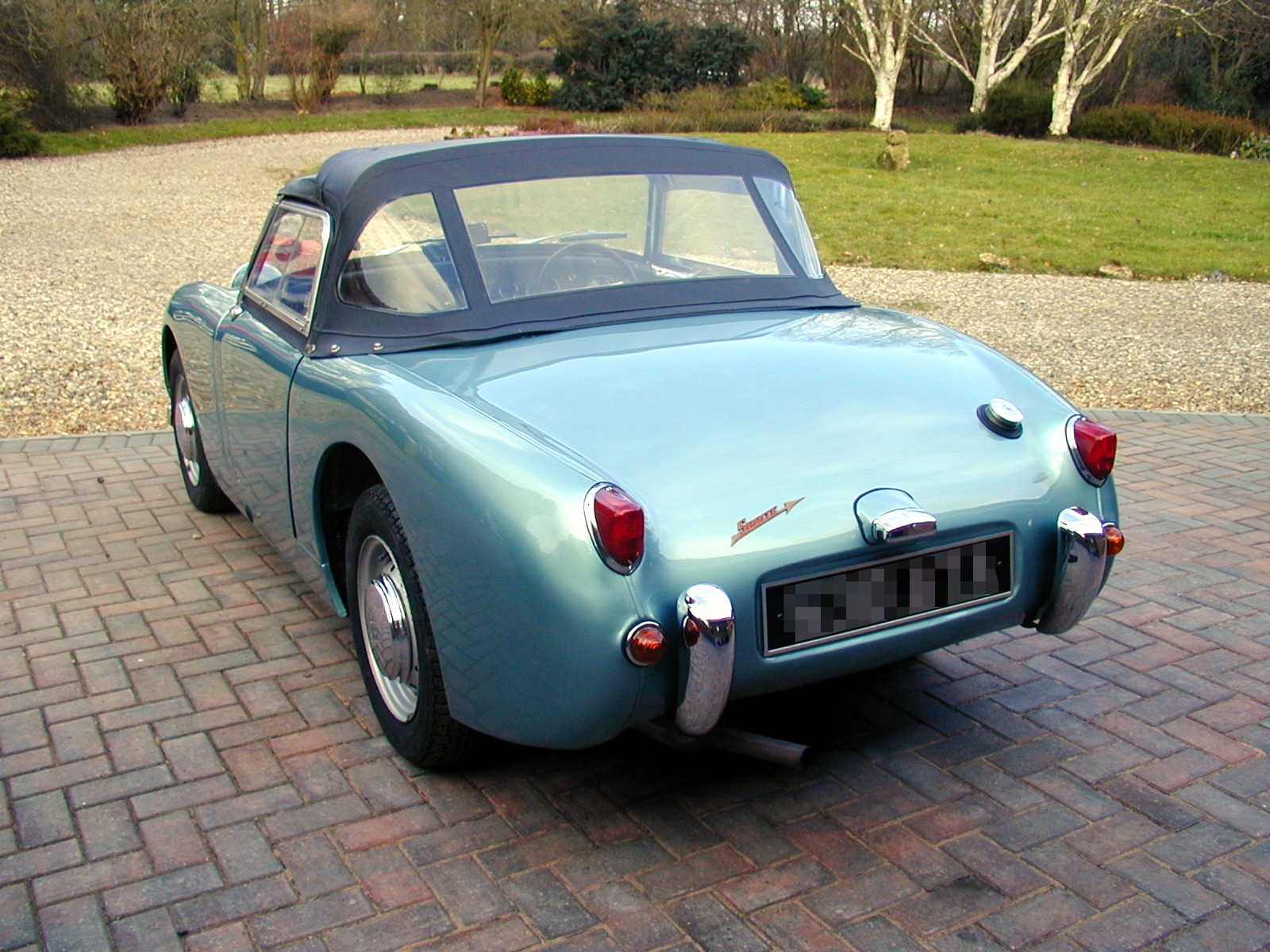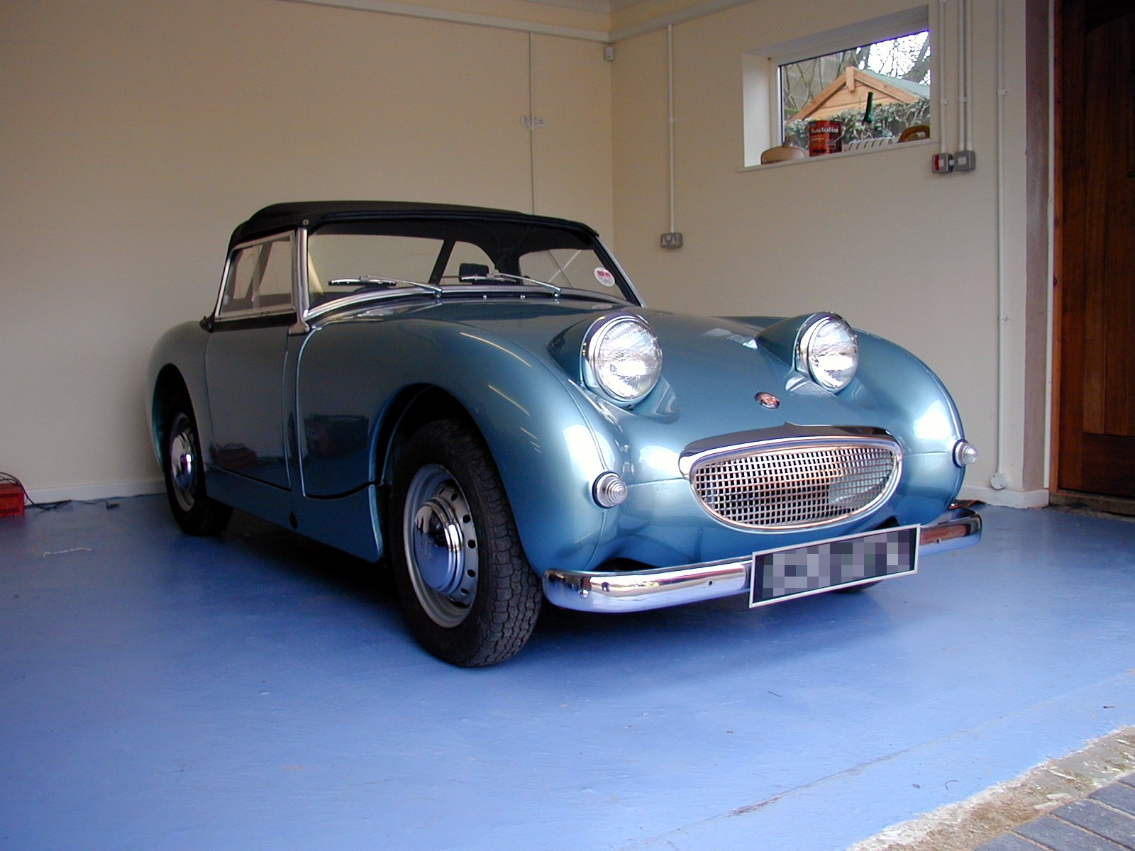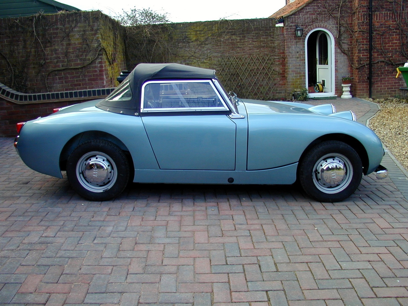 This (my Dad’s car) is of 1958 vintage, and has been totally restored and upgraded. It has the original body (with a steel bonnet) but it has late midget running gear and a 1275cc engine (new in 1991). Consequently its a great little car! And it kinda stops too!! (for a Sprite!).